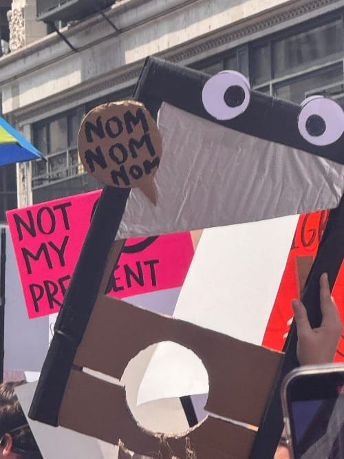 In Los Feliz, it was a giant angry party—the biggest protest I'd ever seen in the neighborhood: a dance party, really. I'd guess 1000 people. The music choices were exactly as good as you'd hope: a whole lot of Sly and the Family Stone, so much Sly. But it also was a little scary. A man pulled up to me in his motorcycle, a giant cross on the back of it, while I was holding the sign I was holding above. He got off his motorcycle, and he flipped us off and stood there, defiant, looking ready to strike. What is it, I wondered, about calling for more money for teachers that made him so angry? My sign wasn't even aggressive. I froze, a stupid grin on my face, part trauma response and part fuck-you-I'm-not-giving-you-the-satisfaction-of-my-hatred. Later, I thought of so many things I wished I'd said. But my brain working was not in the cards, and he took a step towards me, and the lady next to me finally screamed at him to get the fuck out, which seemed to be what he was looking for, because then he seemed satisfied and left then.