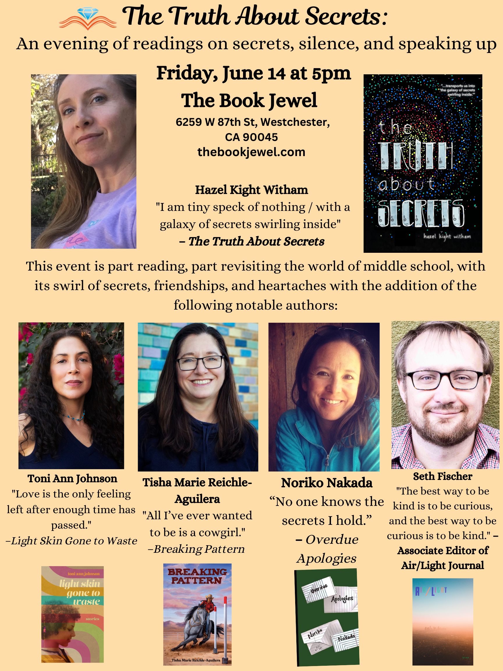 I'm reading with some of my favorite writers tomorrow June 14 at the Book Jewel in Westchester at 5pm. Come help celebrate the incredible Hazel Kight Witham's The Truth About Secrets, and hear me tell an embarrassing story from middle school. Also come hear legends Toni Ann Johnson, Dr. Tisha Marie Reichle-Aguilera, and Noriko Nakada!
